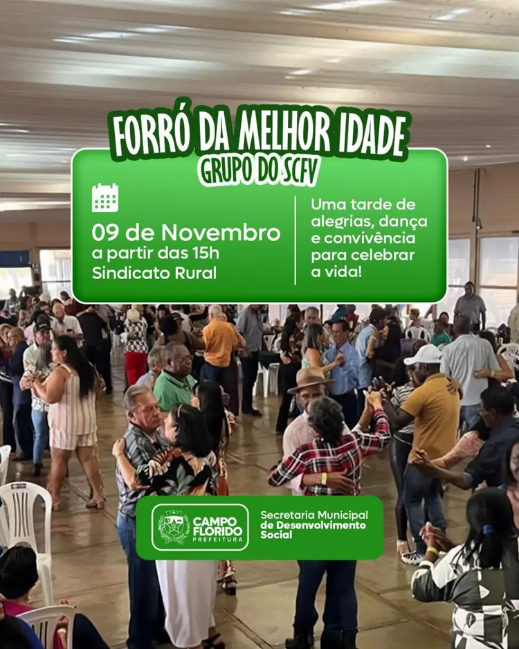O presente chamamento tem como objetivo a seleção de permissionário responsável pela EXPLORAÇÃO DO BAR DO EVENTO “FORRÓ DA MELHOR IDADE”, que será realizado no dia 09 de novembro de 2025, no Sindicato Rural dos Produtores de Campo Florido, com início às 15h e término às 20h.EDITAL CHAMAMENTO FORRÓBa