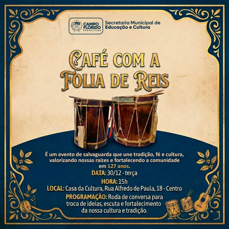 Café com a Folia de Reis Caboclo valoriza Fé, Cultura e Tradição em Campo FloridoA Casa da Cultura recebeu, na tarde do dia 30 de dezembro, a Folia de Santos Reis Caboclo para a realização do 1º Café com a Folia de Reis, um importante encontro que celebrou uma das manifestações culturais mais antiga