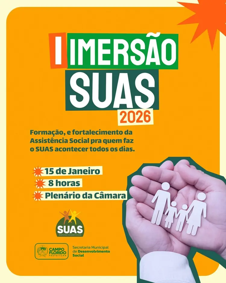 Primeira Imersão SUAS 2026A Secretaria Municipal de Desenvolvimento Social de Campo Florido realizou, nesta quinta-feira (15), no Plenário da Câmara Municipal de Vereadores, a Primeira Imersão SUAS 2026. A iniciativa é voltada à formação e qualificação profissional dos trabalhadores do Sistema Único