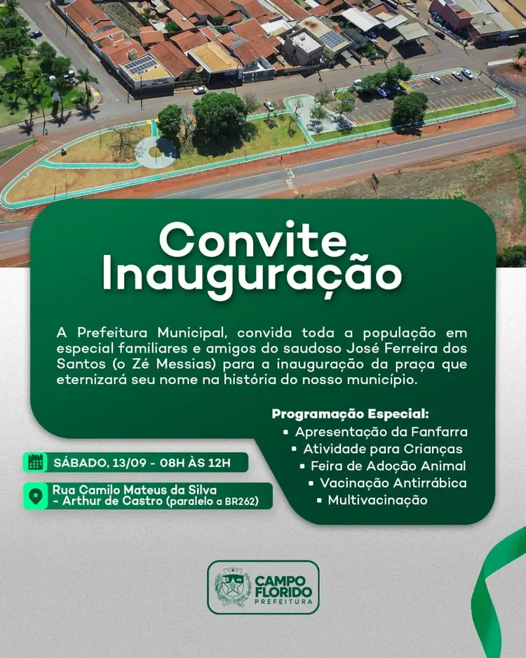A Prefeitura Municipal de Campo Florido tem a honra de convidar toda a população para a inauguração da Praça José Ferreira dos Santos – carinhosamente conhecido como Zé Messias –, uma justa homenagem a um cidadão que deixou um legado de respeito, trabalho e dedicação à nossa comunidade.Local: Rua Ca